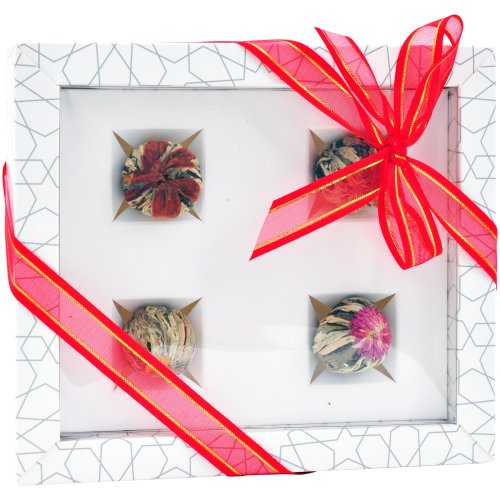 4 db virágos teából álló dekoratív készlet fehér dobozban, piros és arany masnival. Tökéletes ajándék gyönyörű formában.