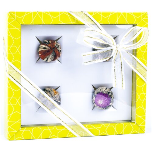 4 virágos teából álló dekoratív készlet lime zöld dobozban, fehér és arany masnival. Tökéletes ajándék gyönyörű formában.