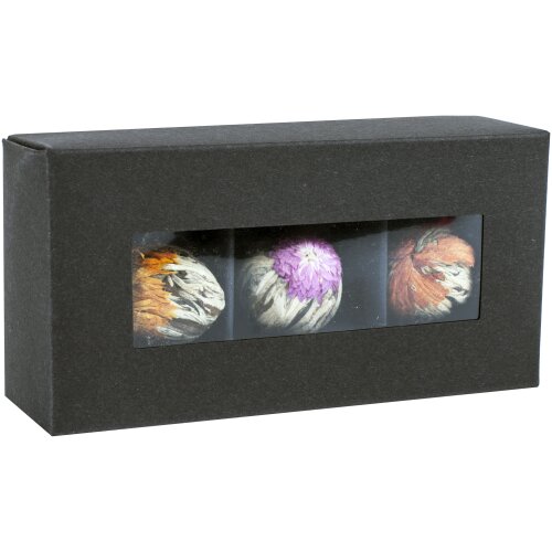 A Blooming Chocolate Box egy gyönyörű fekete dobozban három virágzó teát tartalmaz, amelyek kivételesen exkluzív kompozíciót alkotnak. A legjobb eredmény érdekében körülbelül 600 ml-es átlátszó teáskannában kell főzni.
