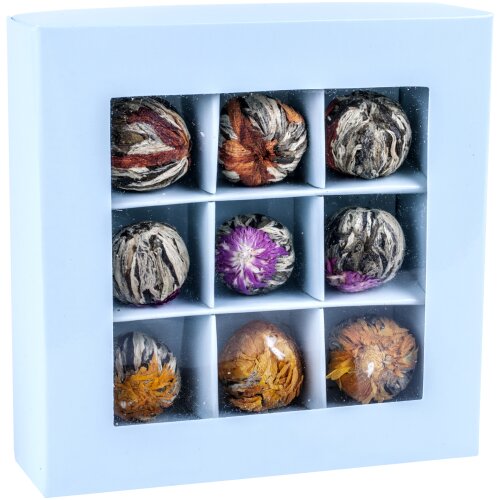A Blooming Tea Box, egy gyönyörű kék dobozban, kilenc virágzó teát tartalmaz, amelyek kivételesen exkluzív kompozíciót alkotnak. A legjobb eredmény érdekében körülbelül 600 ml-es átlátszó teáskannában kell főzni.